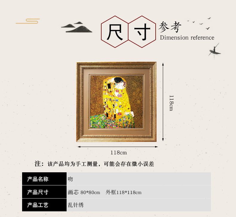首页 » 产品 » 吻手工刺绣装饰画 首页 / 装饰画 / 吻手工刺绣装饰画 吻手工刺绣装饰画 品牌: 绣达人 材质:纯蚕丝、化纤、实木、发泡框 风格:中式 工艺:纯手工宝应乱针绣 规格: 画芯尺寸: 80*80 cm 规格:外框尺寸: 118*118 cm 分类: 装饰画 描述 用户评价 (0) 描述 绣山绣水绣生活,江苏绣达人工艺品有限公司专业手工刺绣26年,精湛的手工刺绣工艺.绣达人公司旗下有500名绣娘,本公司专业生产手工刺绣,手工刺绣产品定制。刺绣手法,苏绣,宝应绣,乱针绣,主要生产手工刺绣装饰画,手工刺绣屏风,手工刺绣扇子,手工刺绣服饰,手工刺绣箱包…. 产品分类: 手工刺绣装饰画,手工刺绣摆件,手工刺绣团扇,手工刺绣服饰,手工刺绣绣品批发,手工刺绣定制 关注我们的微信公众号: 江苏绣达人工艺品有限公司阿里巴巴店铺: 评价 目前还没有评价 成为第一个“吻手工刺绣装饰画” 的评价者 取消回复您的邮箱地址不会被公开。 必填项已用 * 标注名称 * 电子邮件 * 您的评级 * 评价… 完美 很好 普通 还行 极差 您的评价 * 在此浏览器中保存我的显示名称、邮箱地址和网站地址,以便下次评论时使用。 相关产品 装饰画 【丰收的果篮 】手工刺绣苏绣乱针绣宝应绣装饰画 品牌: 绣达人 货号: 材质:纯蚕丝、化纤、实木、发泡框 风格:中式 工艺:纯手工宝应乱针绣 规格: 画芯尺寸:60*80 cm 规格:外框尺寸:76*96 cm 促销中 装饰画 《忘日之星》手工刺绣苏绣乱针绣宝应绣办公室客厅刺绣装饰画 品牌: 绣达人 工艺:纯手工宝应乱针绣 规格: 画芯尺寸:75*135 cm 规格:外框尺寸:87*147cm 装饰画 【硕果满香】 手工刺绣苏绣乱针绣宝应绣装饰画 品牌: 绣达人 货号: 材质:纯蚕丝、化纤、实木、发泡框 风格:中式 工艺:纯手工宝应乱针绣 规格: 画芯尺寸:60*80 cm 规格:外框尺寸:72*96 cm 装饰画 【繁华似锦】 手工刺绣苏绣乱针绣宝应绣装饰画 品牌: 绣达人 货号:HN70100004 材质:纯蚕丝、化纤、实木、发泡框 风格:中式 工艺:纯手工宝应乱针绣 规格: 画芯尺寸:70*100 cm 规格:外框尺寸:82*112 cm